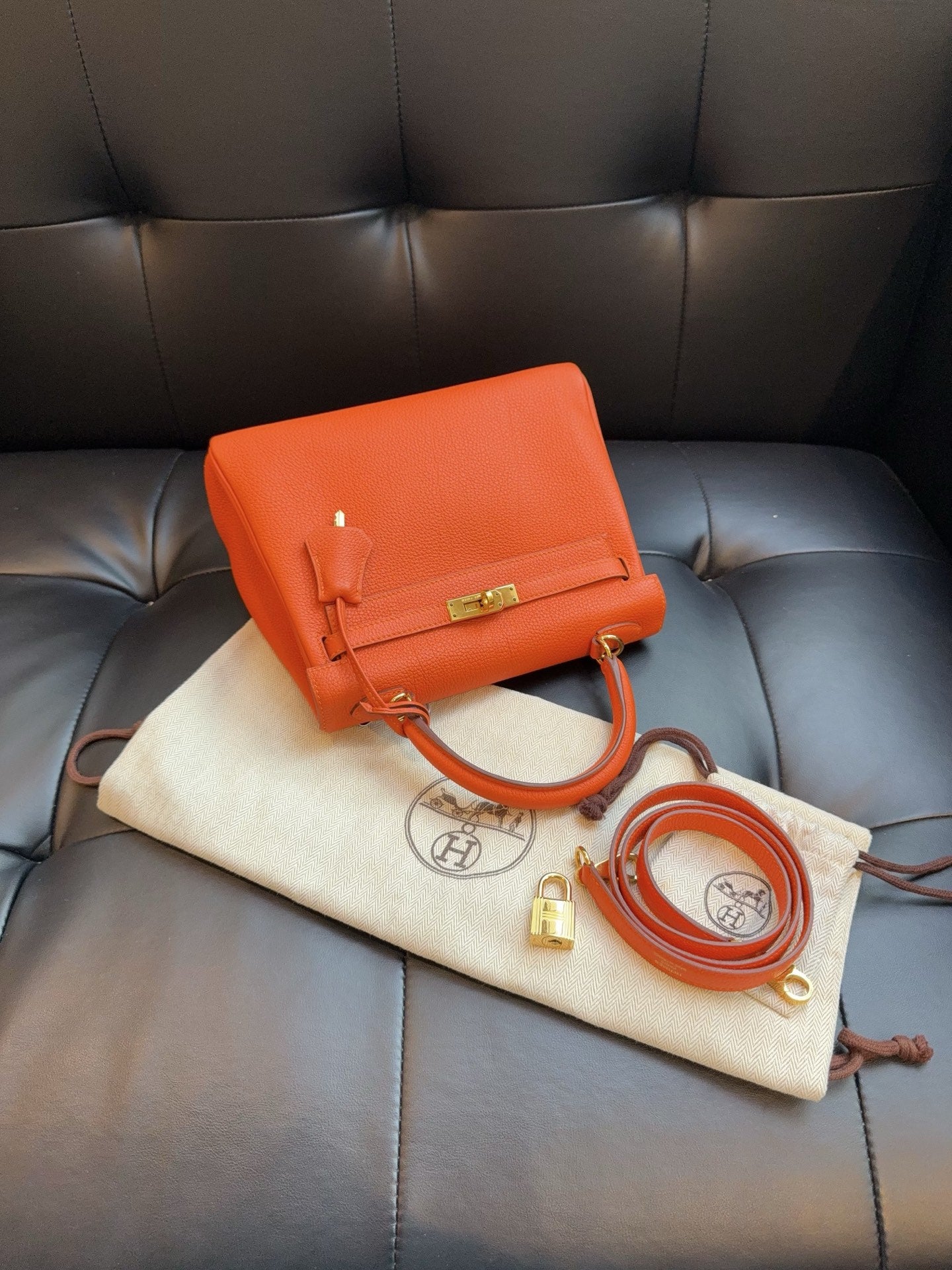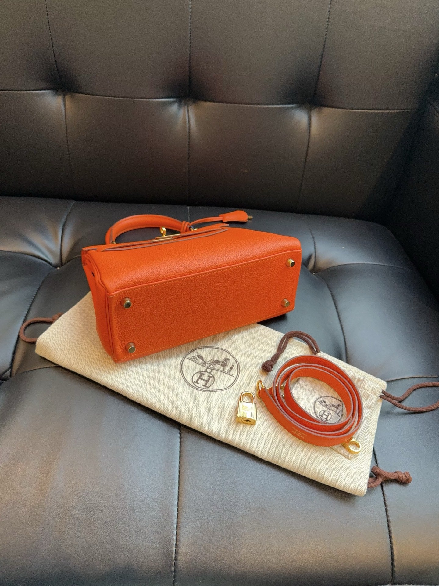 Condition: 98% new. Authentication: T stamp. Measurements: 24 cm (W) x 18 cm (H) x 10 cm (D). Design: A very cute bag, irresistible in its small size. The Sellier style makes the Kelly appear even smaller, giving a more relaxed and casual feel when worn compared to the Retourne style. A regrettable miss to pass up.